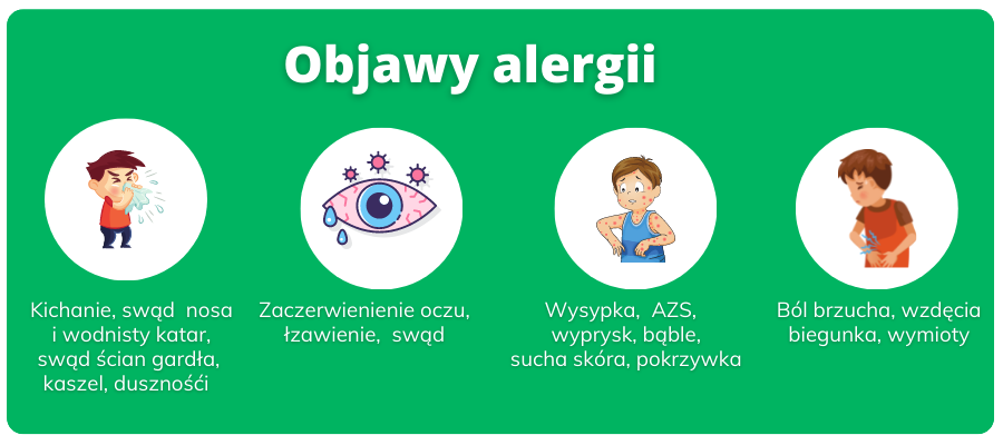 > - Alergia pokarmowa – w tym przypadku alergeny dostają się do organizmu ze spożywanym jedzeniem. Ten rodzaj alergii powoduje przede wszystkim objawy na tle gastrycznym – ból brzucha, biegunka, wymioty oraz objawy skórne takie jak pokrzywka, świąd, zaczerwienienie, obrzęk, oraz duszności. Najczęstszymi alergenami są: mleko krowie, białko jaja kurzego, ryby, gluten, orzechy czy owoce. W późniejszym okresie życia może pojawić się więcej nietolerowanych składników, często współwystępujących razem.
