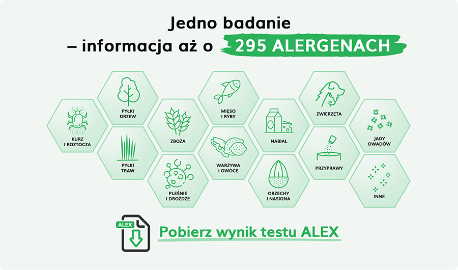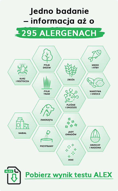 - Informacja o alergiach krzyżowych – wynik dostarczy Ci także cenne informacje na temat czynników alergicznych, na które nie jesteś uczulony, jednak w połączeniu z innym alergenem, mogących wywołać u Ciebie reakcję uczulającą.