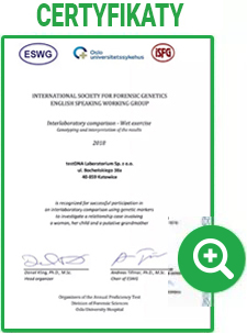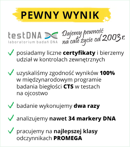 Potwierdzona jakość – testDNA sp. z o.o. posiada liczne certyfikaty, regularnie poddaje się zewnętrznym kontrolom jakości badań DNA. To laboratorium badawcze akredytowane przez Polskie Centrum Akredytacji [w zakresie: Analiza pokrewieństwa, Analiza polimorfizmu DNA z wykorzystaniem układu STR. Metoda: Multipleks PCR z elektroforezą kapilarną] / [w odniesieniu do wymagań PN-EN ISO/IEC 17025], [Nr AB 1618]. Sprawdź dokładny zakres akredytacji…Jako jedyne prywatne laboratorium w Polsce uzyskało m.in. 100% zgodność rezultatów w teście na ojcostwo w programie biegłości CTS (Collaborative Testing Services) z akredytacją ISO/IEC 17043:2010 (organizowany przez amerykańskie stowarzyszenie związane z National Institute of Standard and Technology – Narodowym Instytutem Standardów i Technologii). Certyfikaty laboratorium…