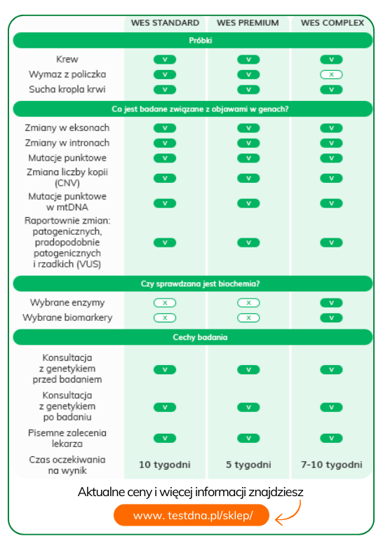 👉 Badanie WES PREMIUM sprawdza wszystkie znane zmiany w genach, o których wiadomo że mogą przyczyniać się do rozwoju objawów choroby wrodzonej i mogą być podstawą do postawienia diagnozy.