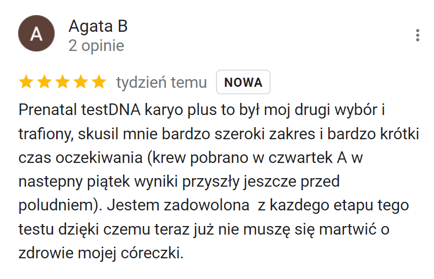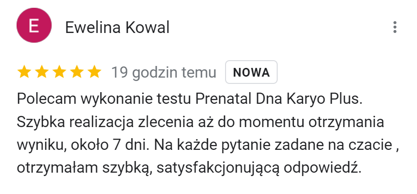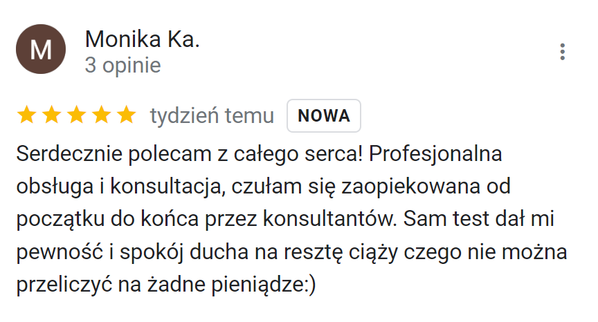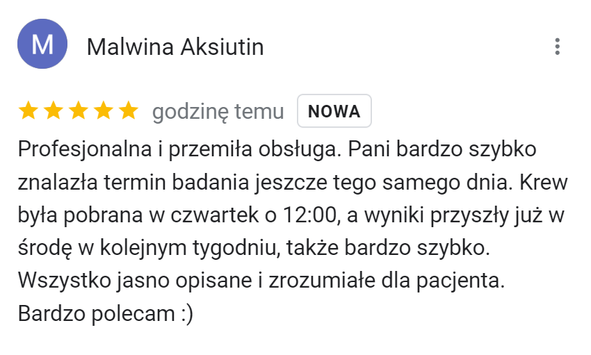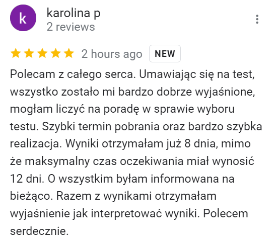 „Szczerze polecam! Kontakt z laboratorium pomimo weekendu był na5+. Wszystkie informacje rzeczowo przekazane, dzięki czemu bardzo łatwo przeszliśmy przez całą procedurę. Wyniki badań zarówno mailem jak i pocztą doszły błyskawicznie. Zdecydowanie polecam!”