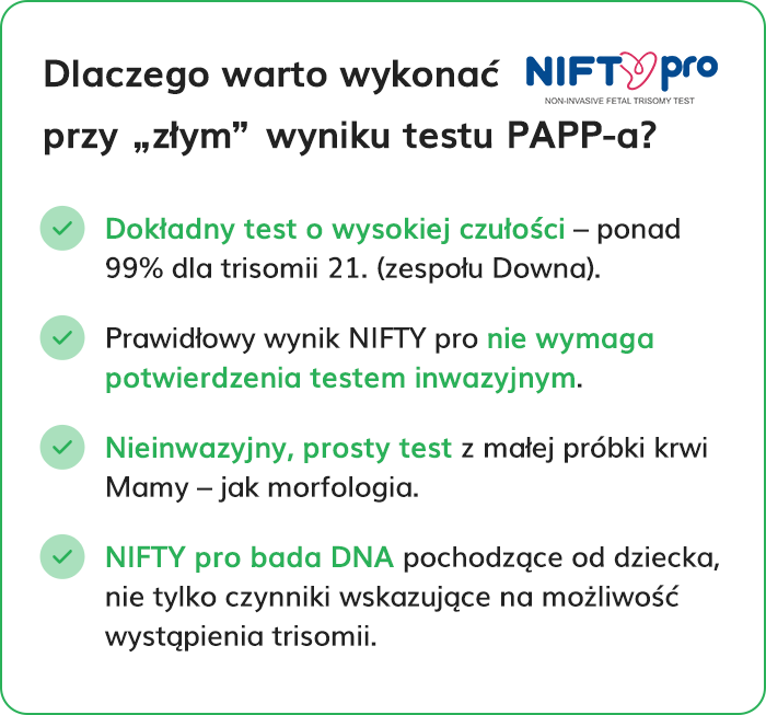 - Jeśli Twój test PAPP-a wykazał ryzyko urodzenia dziecka z trisomią, możesz wykonać test NIFTY pro, aby odzyskać spokój. Ten test w połączeniu z USG możesz wykonać również zamiast testu PAPP-a, aby nie narażać się na stres związany z fałszywym wynikiem.