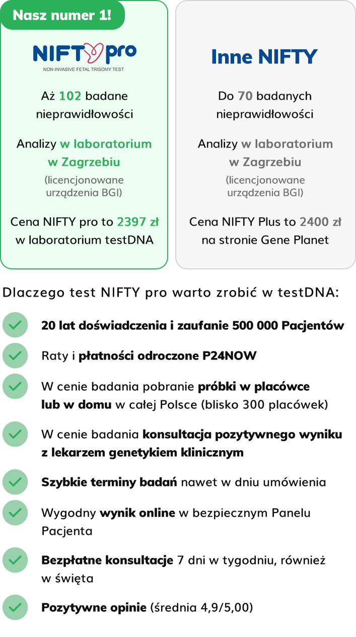- Konsultacja z lekarzem genetykiem klinicznym w cenie badania w przypadku pozytywnego wyniku NIFTY pro. Wyniki NIFTY pro w testDNA konsultuje specjalista genetyki klinicznej i członek Polskiego Towarzystwa Genetyki Człowieka.