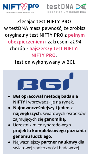 - Konsultacja z lekarzem genetykiem klinicznym w cenie badania w przypadku pozytywnego wyniku NIFTY pro. Wyniki NIFTY pro w testDNA konsultuje specjalista genetyki klinicznej i członek Polskiego Towarzystwa Genetyki Człowieka.