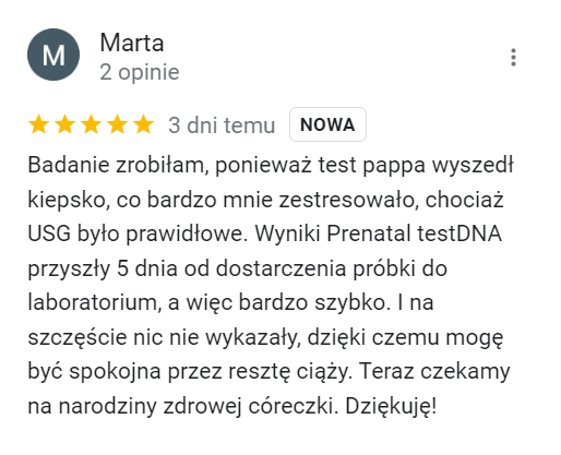 „Szczerze polecam! Kontakt z laboratorium pomimo weekendu był na5+. Wszystkie informacje rzeczowo przekazane, dzięki czemu bardzo łatwo przeszliśmy przez całą procedurę. Wyniki badań zarówno mailem jak i pocztą doszły błyskawicznie. Zdecydowanie polecam!”