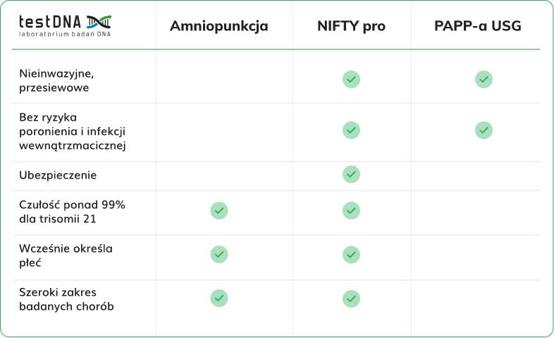 Jeśli chcesz ocenić ryzyko trisomii 21 w sposób nieinwazyjny, możesz rozważyć testy NIPT, takie jak NIFTY pro oraz FeliaTest.
