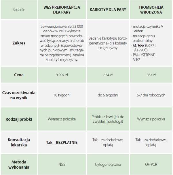 - wybrane mutacje genetyczne związane z krzepnięciem krwi i ryzykiem powikłań ciążowych,