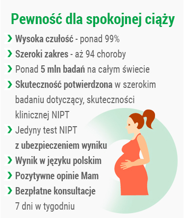 Jeśli zastanawiamy się, jakie badania w ciąży warto wykonać, należy zwrócić uwagę także na to, że test NIFTY pro to jedyne badanie prenatalne z ubezpieczeniem. Jeśli wynik testu NIFTY pro wskaże nieprawidłowości i będzie konieczne wykonanie badania diagnostycznego, rodzice nie będą musieli ponosić kosztów tego drugiego badania (refundacja wynosi do ok. 2600 zł, w zależności od kursu walut). Ubezpieczenie obejmuje także sytuację, kiedy test da wynik fałszywie negatywny – wtedy rodzice mogą liczyć na rekompensatę finansową w wysokości nawet do 210 000 złotych ( zależności od kursu walut). W przypadku uzyskania wyniku wskazującego na nieprawidłowości, rodzice mają zapewnioną również konsultację z lekarzem genetykiem. Więcej informacji o teście NIFTY pro