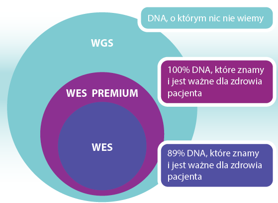 Większość badań WES oferowanych na rynku skupia się na analizie eksonów. Z kolei badanie WGS analizuje cały genom, obejmujący zarówno eksony, jak i sekwencje niekodujące, w tym introny, regiony regulatorowe, sekwencje powtarzalne i inne fragmenty DNA. WES Premium łączy jednak zakres badania WES i WGS. Dzięki dodatkowym sondom analizuje nie tylko eksony ale także istotne klinicznie introny i regulatorowe RNA. Można więc powiedzieć, że badanie WES Premium analizuje to samo co WGS z tym, że zastosowanie tych testów jest inne.