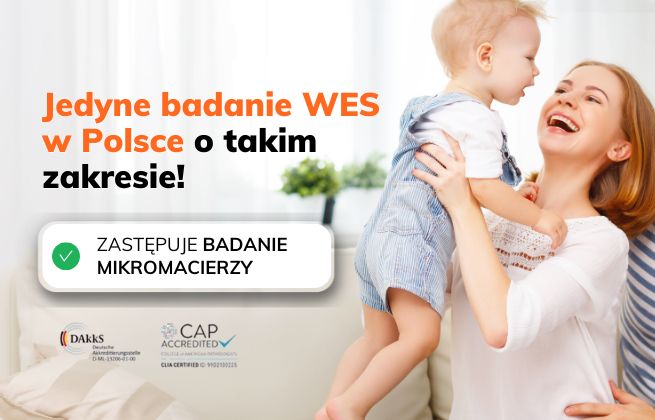 Badanie WES (sekwencjonowanie całego eksomu) to najszersze dostępne badanie genetyczne. Pozwala na bardzo precyzyjną diagnostykę, dzięki analizie 23 000 genów z jednej próbki.