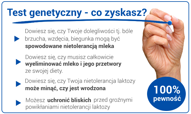 Kolejnym argumentem przemawiającym za wykonaniem badania genetycznego jest to, że jeśli to nie geny są odpowiedzialne za wystąpienie u Ciebie nietolerancji laktozy, to znaczy, że choroba ta może być objawem innego schorzenia np. celiakii lub też zapalenia jelit. Konieczne jest wtedy dalsze poszukiwanie przyczyny bólu brzucha, wzdęć czy biegunki po mleku. Znalezienie właściwej przyczyny nietolerancji laktozy i jej wyleczenie pozwala w tym przypadku na bezpieczny powrót do spożywania produktów mlecznych bez nieprzyjemnych dolegliwości.