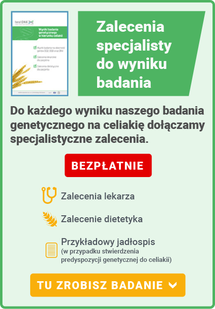 1. Wybierz badanie 2. Wybierz badanie w punkcie pobrań lub wizytę domową 3. Wybierz termin 4. Dane kontaktowe Robiłam badania w kierunku nietolerancji pokarmowych, wszystko sprawnie i bez problemów. Gdybym potrzebowała to na pewno wrócę tu po kolejne testy Serdecznie polecam. Pakiet badań najtańszy jaki znalazłam. Szybka wysyłka i szybki wynik. Naprawdę polecam ludziom z objawami celiakii. Od kilku lat staraliśmy się z mężem o dziecko.. niestety do pewnego momentu wszystkie ciąże kończyły się poronieniami. Od swojego lekarza usłyszałam, że w moim przypadku warto zbadać się w kierunku nietolerancji glutenu. To była najlepsza decyzja w naszym życiu. Niebawem na świat przyjdzie nasze pierwsze dziecko. Jesteśmy przeszczęśliwi za wsparcie, które otrzymaliśmy, dzieląc się naszą historią. Wspólnie z rodziną robiliśmy badania na nietolerancje pokarmowe. Okazało się, że jedna z córek odziedziczyła wadliwe geny.. Teraz wspólnie dbamy o naszą dietę. Bardzo dziękuję Pani Joannie za pomoc w organizacji badania dla naszej czwórki. Kontakt bezproblemowy, wynik uzyskany dwa dni przed czasem. Polecam. Córka od wielu tygodni miała nawracające problemy żołądkowe. Po badaniach na nietolerancje pokarmowe okazało się, że przyczyną jest nietolerancja laktozy. Pobranie próbki było całkowicie bezbolesne, córka nawet nie zorientowała się, że już jest po badaniu. Dziękuję za pomoc. Skorzystalam z pakietu zdrowe jelita. Na szczescie w badaniach nie wyszly zadne wady i nie musze juz wykonywac testow z krwi. Od dłuższego czasu zastanawiałam się nad testami na celiakię. Zdecydowałam się na badania genetyczne. W końcu wiem, co stało za moimi uciążliwymi dolegliwościami. Mam nadzieję, że wprowadzona dieta przyniesie niebawem oczekiwane efekty Zdecydowałam się na pakiet nietolerancji laktozy z glutenem. Zazwyczaj nie mam czasu by chodzić po lekarzach dlatego zdecydowałam się wykonać badania na własną rękę. Otrzymałam zestaw do pobrania wymazów bezpośrednio do domu, a następnego dnia kurier zabrał całą paczkę. Wynik dostałam po 10 dniach, tak więc wszystko zgodnie z obietnicami. 5/5 Wiele osób nie zdaje sobie sprawy z tego, do czego może doprowadzić nieleczona celiakia. Tymczasem średni okres diagnostyczny choroby wynosi 10 lat… W tym czasie z pozoru nic nieznaczące objawy celiakii mogą przerodzić się w poważne choroby, np. osteoporozę, łysienie plackowate czy nawet nowotwór. Nieleczona celiakia 40-krotnie zwiększa ryzyko rozwoju nowotworów układu pokarmowego (głównie chłoniaków). Niektórzy mogą pomyśleć: „odstawię gluten na chwilę i sprawdzę, czy mój stan zdrowia się poprawi…” Niestety takie postępowanie jest zgubne, ponieważ często nie zdajemy sobie sprawy, w czym tak naprawdę obecny jest gluten. Często dieta bezglutenowa jest bez glutenu tylko z nazwy. Osobie chorej na celiakię szkodzi nawet minimalna ilość tej substancji, np. zawarta w płatkach owsianych, które teoretycznie są bezglutenowe, ale zostały na linii produkcyjnej zanieczyszczone mąką pszenną. Taki produkt nie jest bezpieczny dla osoby z celiakią. Pierwszym krokiem jest badanie genetyczne. Badana jest obecność genów DQ2,2, DQ2,5, DQ8. Jeżeli się okaże, że nie mamy tych genów to praktycznie w 100% można wykluczyć celiakię zarówno teraz jak i w przyszłości. Na wynik tego badania nie ma wpływu dieta bezglutenowa i można je wykonać nawet u małych dzieci. Drugim krokiem jest wykonanie badań z krwi na przeciwciała. Jeśli pacjent posiada chociaż jeden gen odpowiedzialny za celiakię wskazane jest badanie serologiczne na obecność przeciwciał : przeciwko transglutaminazie tkankowej (tTG) przeciwko deaminowanemu peptydowi gliadyny (DGP). W skład badania wchodzi także ogólny poziom IgA, który jest wskaźnikiem miarodajności i pewności badania. Dowiedz się więcej o diagnostyce celiakii krok po kroku >> Treści na tej stronie zostały przygotowane przez zespół specjalistów laboratorium testDNA, które od ponad 20 lat zajmuje się badaniami DNA w Polsce. Naszą misją jest dostarczanie pacjentom rzetelnych informacji oraz nowoczesnych rozwiązań diagnostycznych. W pracach nad materiałami edukacyjnymi uczestniczą lekarze, diagności laboratoryjni oraz konsultanci medyczni, którzy na co dzień wspierają kobiety po poronieniach i pary zmagające się z niepłodnością.