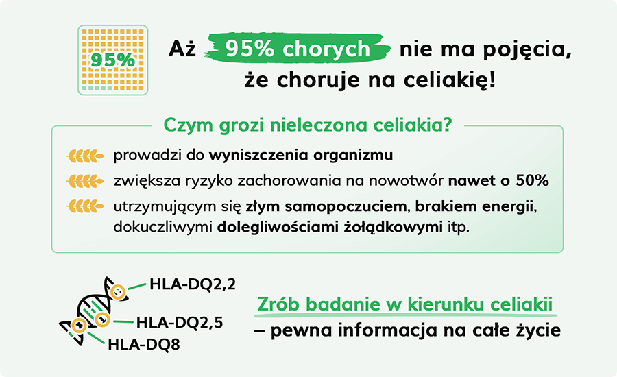 Badania mówią, że aż 95% chorych nie wie o swojej celiakii, pomimo iż testy na celiakię są ogólnodostępne, a średni okres postawienia diagnozy wynosi 10 lat. Jest to spowodowane tym, że objawy celiakii często są nietypowe i pacjenci nie zgłaszają się do lekarza / nie wykonują badań w kierunku celiakii.