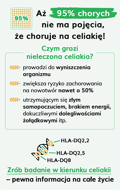 Nie każdy, kto posiada dany układ genów zachoruje na celiakię. Wpływa na to wiele czynników tak zwanych środowiskowych np. stres, przebyte choroby, ciąża itp. Warto jednak wiedzieć, że brak genów HLA DQ2 i DQ8 w 100% wyklucza celiakię!