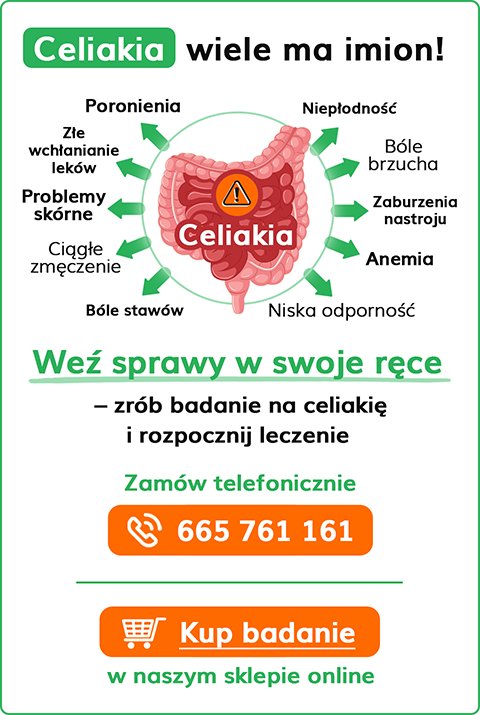 Sprawdź promocyjny pakiet – dwa badania w niższej cenie! Jeśli Twoim problemem są ból brzucha, wzdęcia, zaparcia to polecamy Ci pakiet badań „Zdrowe jelita”. W ramach tego pakietu sprawdzisz, czy chorujesz na celiakię i nietolerancję laktozy. Badanie wykonasz z jednej próbki, co pozwoli Ci zaoszczędzić czas oraz pieniądze!
