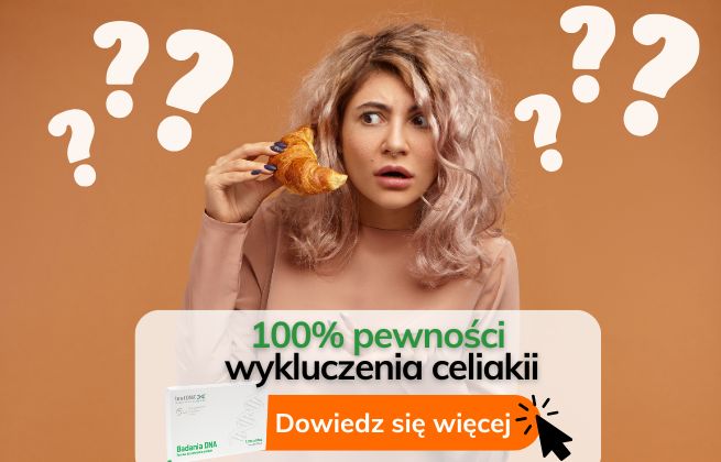 Objawy celiakii (nietolerancji glutenu) bywają bardzo różnorodne. Mówi się, że nie ma dwóch takich samych postaci tej choroby. Spośród tych najczęściej wymienianych są objawy gastryczne czyli: bóle brzucha, wzdęcia brzucha, biegunki, zaparcia czy wymioty. Choć nie oznacza to, że każda osoba z celiakią musi mieć te dolegliwości, to w ich przypadku szczególnie warto wykonać badanie w kierunku trwałej nietolerancji glutenu. Gastryczne objawy celiakii bardzo często bywają mylone np. z zespołem jelita drażliwego, alergią pokarmową, niestrawnością czy nieswoistym zapaleniem jelit. Warto wiedzieć! Objawy celiakii ze strony układu płciowego to nie tylko obniżone libido ale przede wszystkim problemy z poczęciem dziecka wynikające z niedoboru kwasu foliowego, żelaza oraz innych ważnych mikroelementów i witamin. Pamiętajmy, że uszkodzone jelita nie są w stanie prawidłowo wchłaniać substancji odżywczych. Częstym objawem celiakii są poronienia, w tym poronienia nawykowe, a u mężczyzn problemy z erekcją i niska jakość nasienia. Inne problemy pojawiające się przy celiakii to zaburzenia miesiączkowania i wczesna menopauza. Co ważne większość z nich jest odwracalna! Dlatego badanie na celiakię jest zalecane u par, które zmagają się z niepłodnością. Warto wiedzieć! Skórna postać celiakii jest dla pacjenta wyjątkowo niekomfortowa ponieważ zmiany swędzą, co prowadzi do drapania i powstawania ran. Na szczęście właściwe wykrycie ich przyczyny czyli zdiagnozowanie celiakii pozwala na szybką ulgę. Zastosowanie diety, a czasem dodatkowych leków pozwala wyeliminować te zmiany skórne praktycznie w 100%. Podstawowe objawy skórne celiakii to: wypryski, trądzik, łupież, łamliwe i wypadające włosy, egzema, łuszczyca Istnieje również skórna postać celiakii nazywana chorobą Duhringa, w której występują objawy skórne przypominające opryszczkę – pęcherzyki i grudki znajdujące się na rumieniowatych plamach. Pojawiają się najczęściej w okolicach stawów łokciowych i kolanowych ale też między łopatkami, na pośladkach czy karku. Często umiejscowione są symetrycznie np. na obu łokciach czy kolanach. Objawy celiakii ze strony układu nerwowego są często mylnie diagnozowane ponieważ mało kto zdaje sobie sprawę z tego, że celiakia może być przyczyną takich dolegliwości. Oprócz wymienionych poniżej neurologicznych symptomów celiakii zdarzają się również zaburzenia mowy, tiki nerwowe, zaburzenia chodu i odczuwania smaku oraz węchu. Nawet 50% pacjentów ze świeżo zdiagnozowaną celiakią ma objawy neurologiczne. Najczęstsze neurologiczne objawy celiakii: migrena, napadowe bóle głowy, drżenie rąk i nóg, zaburzenia równowagi oraz zaburzenia słuchu, ataksja, padaczka , bóle mięśni i ścięgien. U osób z niezdiagnozowaną celiakią spotykamy m.in problemy z kośćmi w tym osteoporozę i osteopenię, drżenie mięśni, obrzęki, bóle mięśni i stawów, zapalenia stawów oraz jeśli celiakia wystąpi w wieku dojrzewania również niski wzrost. Objawy celiakii u dzieci mogą być bardzo zróżnicowane w zależności od wieku dziecka. Szybka diagnostyka celiakii jest w przypadku dzieci niezwykle ważna ponieważ większość konsekwencji nieleczonej celiakii można cofnąć pod warunkiem wdrożenia leczenia. Przykładowo dziecko, które wolniej rośnie i jest najniższe w klasie, a do tego słabiej się uczy po zastosowaniu leczenia może dogonić swoich rówieśników. Obecnie nawet 7 razy częściej spotyka się celiakię skąpoobjawową czy bezobjawową (powodującą nietypowe dolegliwości, np. anemię, podwyższony poziom cholesterolu, zaburzenia neurologiczne, niepłodność czy poronienia), co może powodować kłopoty diagnostyczne i być wyzwaniem dla lekarzy. To właśnie dlatego średni czas postawienia diagnozy celiakii w Polsce to aż 10 lat. Za pomocą poniższego formularza możesz umówić się na badanie celiakii w dowolnym momencie! Wystarczy że podasz preferowany termin badania, a my dla Ciebie wszystko zorganizujemy! Zobacz jakie to proste. Dzięki badaniu genetycznemu dowiesz się, czy Twój organizm ma predyspozycje do celiakii, a co najważniejsze – wynik ujemny pozwoli Ci raz na zawsze wykluczyć celiakię. To oznacza, że możesz żyć bez obaw, nawet jeśli w Twojej rodzinie występuje nietolerancja glutenu. Badanie jest szybkie, bezbolesne i można je wykonać w dowolnym momencie – także podczas stosowania diety bezglutenowej. Co więcej, jego wynik daje odpowiedź na całe życie, co oszczędza stres i niepewność w przyszłości. Oprócz jasnej diagnozy test zapewnia konkretne korzyści: Umów się na badanie
