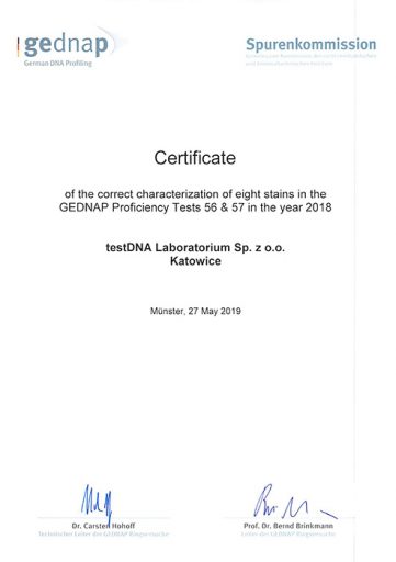 testDNA Laboratorium Sp. z o.o. uzyskało prestiżowy certyfikat GEDNAP 56 i 57 w programie biegłości w testach DNA. Zakres obejmował oznaczanie profili genetycznych z próbek mikrośladowych oraz mieszanin DNA. Certyfikat jest przyznawany przez Niemieckie Instytuty Kryminalistyki i Medycyny Sądowej i potwierdza najwyższą jakość analiz DNA wykonywanych w laboratorium.
