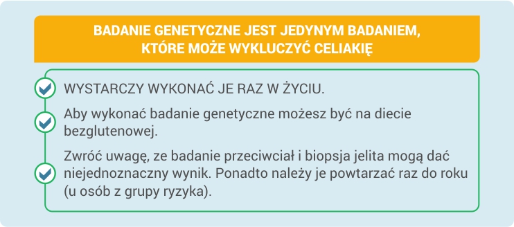 Jeśli celiakia zostanie wykryta, konieczna jest dieta całkowicie bezglutenowa. Nawet najmniejsza ilość tego białka u chorych z celiakią jest bowiem bardzo niebezpieczna. Warto również wiedzieć, że dawne przekonania o celiakii jako chorobie wieku dziecięcego są błędne. Schorzenie może pojawić się i zostać wykryte w każdym wieku, nie tylko u dzieci.