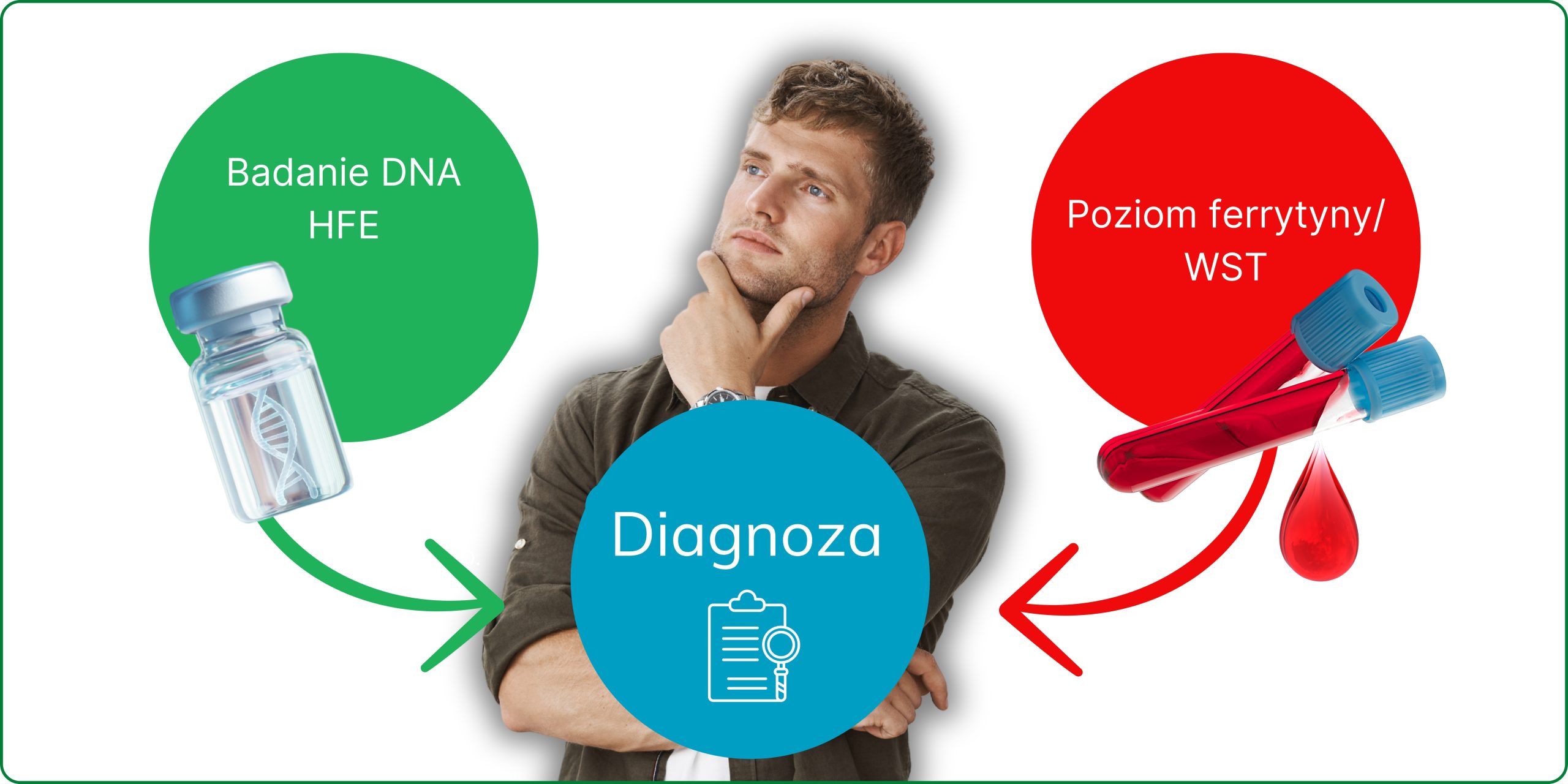 Hemochromatoza może dawać bardzo niespecyficzne objawy: osłabienie, zmęczenie, ból stawów, dolegliwości ze strony układu pokarmowego. Z tego względu często mylona jest z innymi schorzeniami. Charakterystyczne dla hemochromatozy jest pojawienie się objawów w wieku 40-60 lat i czasami nadmierna pigmentacja skóry twarzy. Podejrzenia w kierunku hemochromatozy może rzucić już nieprawidłowa morfologia krwi, jednak sam poziom żelaza to za mało – tylko badanie genu HFE daje pewność diagnozy.