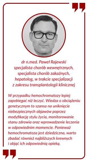 Rozpoczęcie terapii na etapie wczesnych objawów często pozwala je cofnąć. Wbrew powszechnym opiniom, zmiana diety nie jest wystarczająca, aby trwale obniżyć niebezpieczny poziom żelaza. Ograniczenie spożywania witaminy C, czerwonego mięsa, czy alkoholu może jedynie zmniejszyć wchłanianie kolejnych ilości tego pierwiastka. Mało osób wie, że z pożywieniem pobieramy jedynie około 1 miligram żelaza, podczas gdy stały poziom żelaza u zdrowego dorosłego człowieka to 3 do 5 gramów! Leczenie hemochromatozy opiera się przede wszystkim na regularnych upustach krwi, dzięki którym zaburzone parametry gospodarki żelazem (ferrytyna, WST, TIBC) po jakimś czasie wracają do prawidłowego poziomu. Już po pierwszych upustach chorzy odczuwają poprawę samopoczucia. Ostateczną decyzję o rozpoczęciu i rodzaju leczenia podejmuje lekarz specjalista: gastroenterolog lub hepatolog. Więcej na temat leczenia hemochromatozy można przeczytać tutaj: Nadmiar żelaza – jak leczyć?