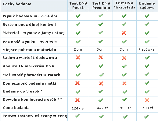 ** Podstawowy test na ojcostwo przeznaczony jest dla 2 lub trzech osób w następującej konfiguracji : matka, dziecko, domniemany ojciec. Oznacza to, iż w badaniu nie może uczestniczyć np. dwóch domniemanych ojców. Z kolei w sądowym badaniu na ojcostwo muszą uczestniczyć matka, dziecko oraz domniemany ojciec.