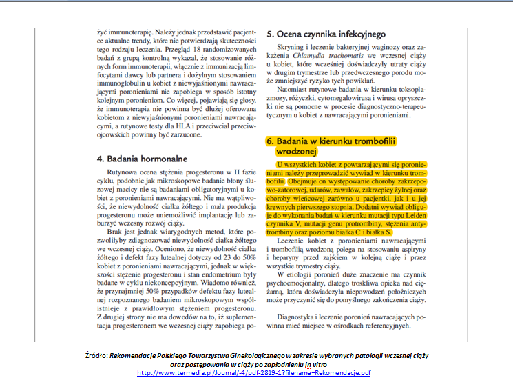 Badanie na trombofilię wrodzoną jest rekomendowane przez Polskie Towarzystwo Ginekologiczne u pacjentek, które poroniły.