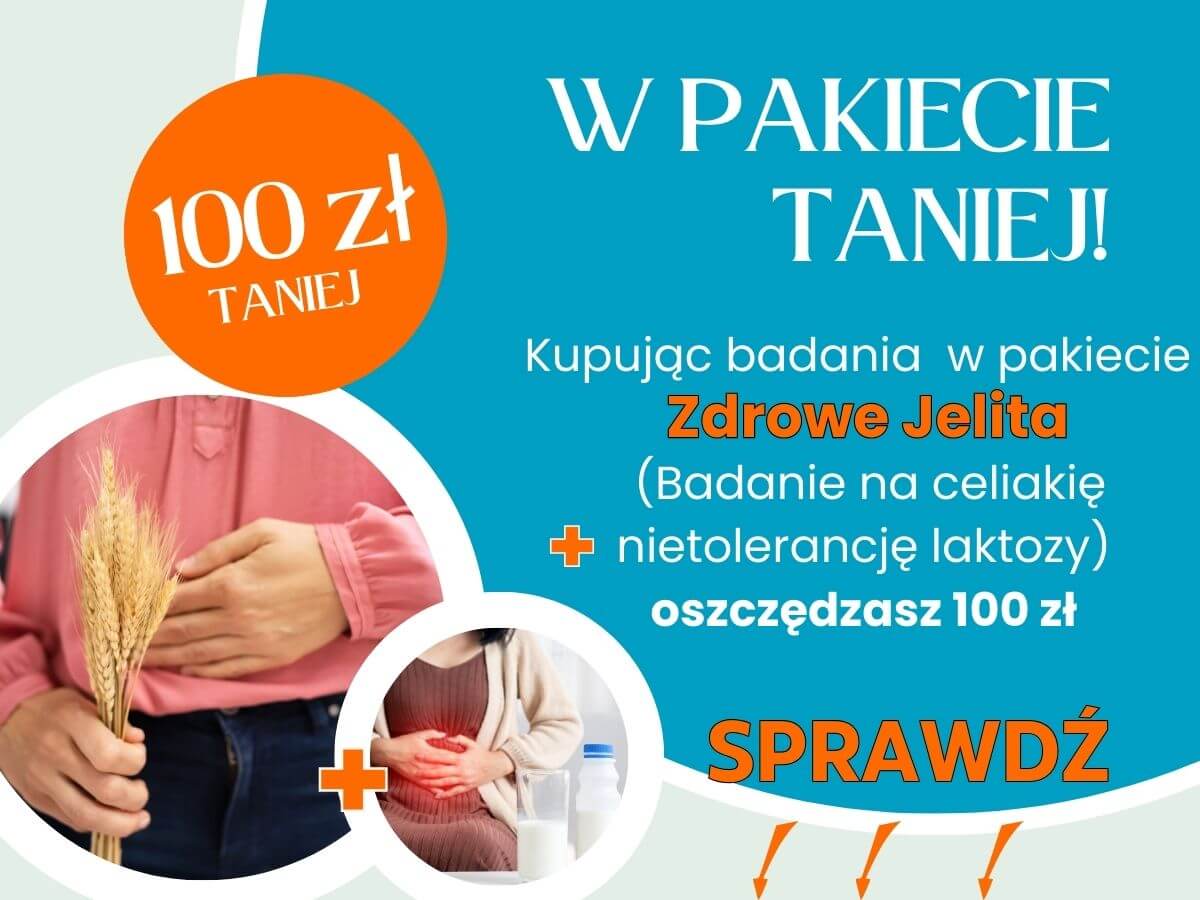 Kup teraz i zapłać później za 30 dniNieleczone nietolerancje pokarmowe to poważny problem! W wielu przypadkach od momentu wystąpienia pierwszych objawów, do postawienia właściwej diagnozy mija zbyt wiele czasu. Nie czekaj i zadbaj o siebie już teraz. Sprawdź Pakiet Zdrowe Jelita, dzięki któremu zbadasz się pod kątem najpopularniejszych nietolerancji pokarmowych i zaoszczędzisz aż 100zł!