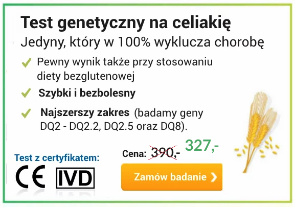 Celiakia jest trwałą (to znaczy trwającą przez całe życie) nietolerancją glutenu, która zapisana jest w naszych genach. To znaczy, że tylko te osoby, które mają pewne geny (DQ2 i DQ8) mogą na nią zachorować. Innymi słowy jeśli nie masz predyspozycji genetycznych prawdopodobnie nigdy nie zachorujesz na celiakię. Dlatego najlepszym badaniem na celiakię jest test genetyczny.
