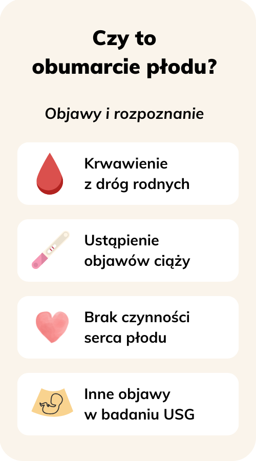 Pierwsze objawy obumarcia płodu we wczesnej ciąży często są bardzo niespecyficzne. Może pojawić się plamienie lub krwawienie, a czasem zauważasz, że objawy ciążowe nagle znikają – przestajesz czuć napięcie piersi, mdłości czy inne zmiany w organizmie.