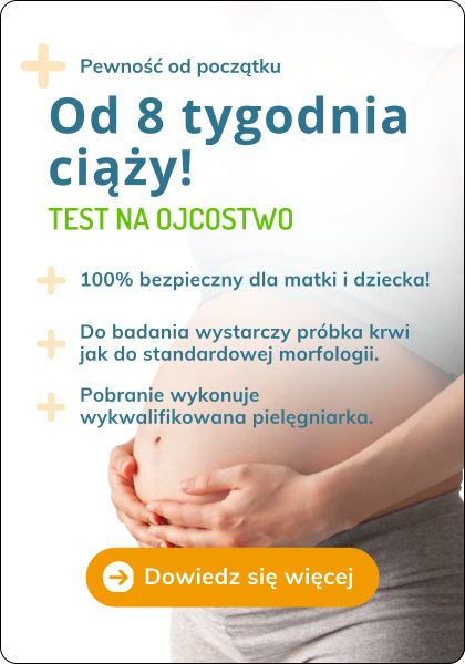Od 15. tygodnia ciąży dostępny jest też test DNA na ojcostwo z płynu owodniowego i dowolnych próbek rodziców – badanie wykonywane u 7 najlepszych specjalistów w Polsce. Poczytaj więcej: Test na ojcostwo w ciąży