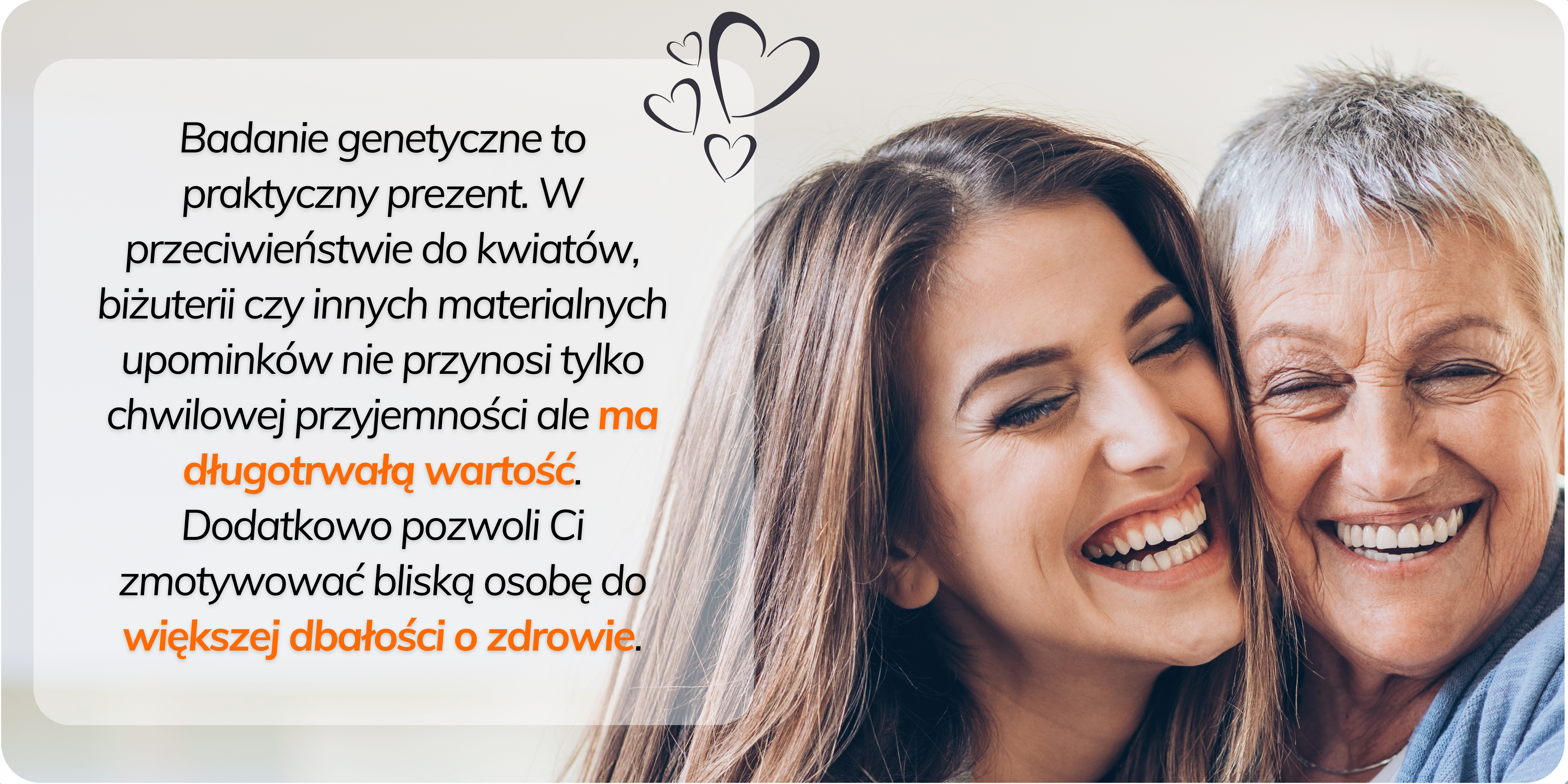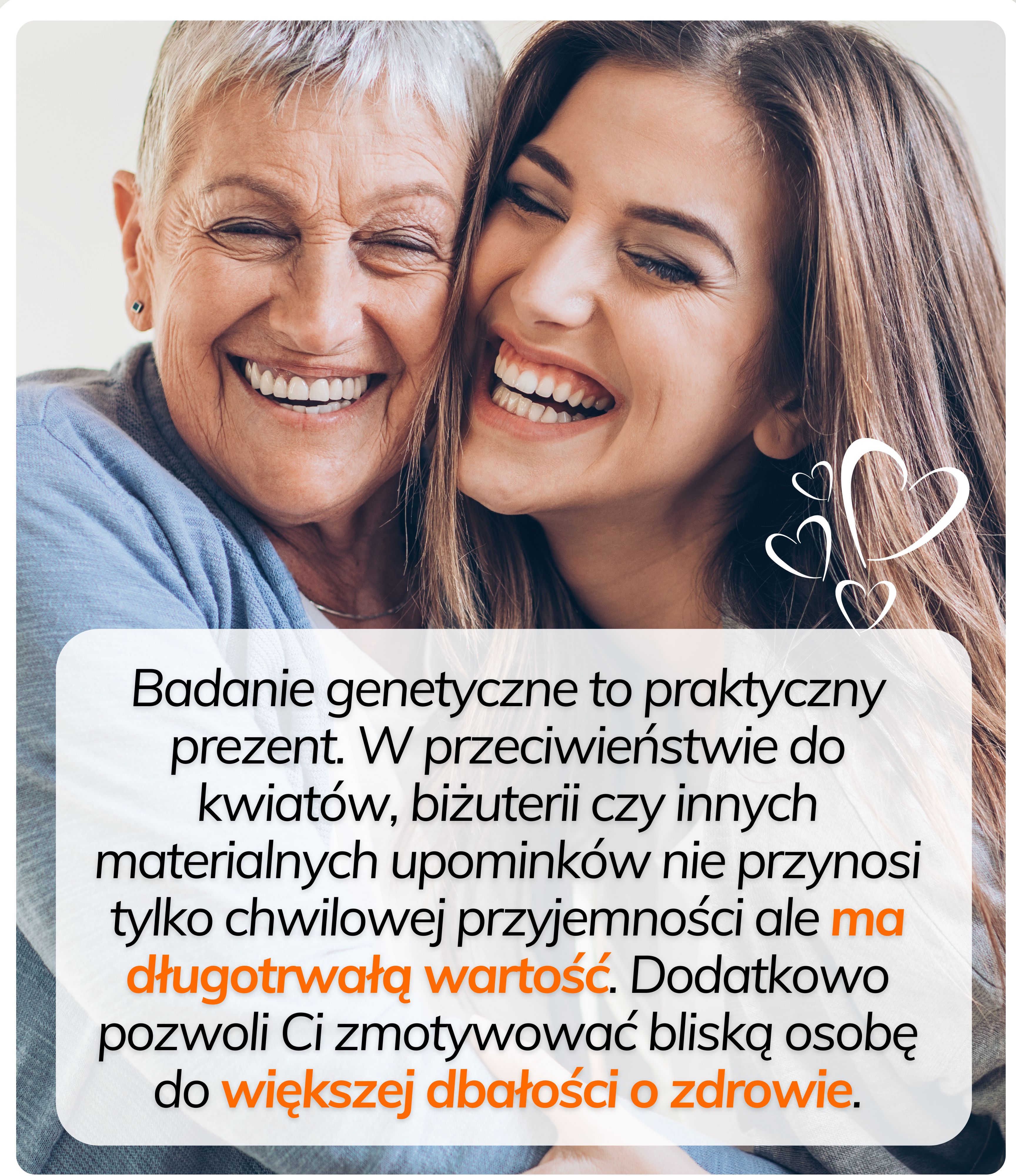 Nie ma nic cenniejszego niż zdrowie. Możesz podarować swojej mamie wybrane badanie genetyczne, dzięki czemu pokażesz jej jak bardzo się o nią troszczysz i że zależy Ci na tym, aby żyła długo w zdrowiu. Skorzystaj z wygodnych płatności odroczonych i kup prezent dla mamy dziś, a zapłać za niego dopiero za 30 dni.