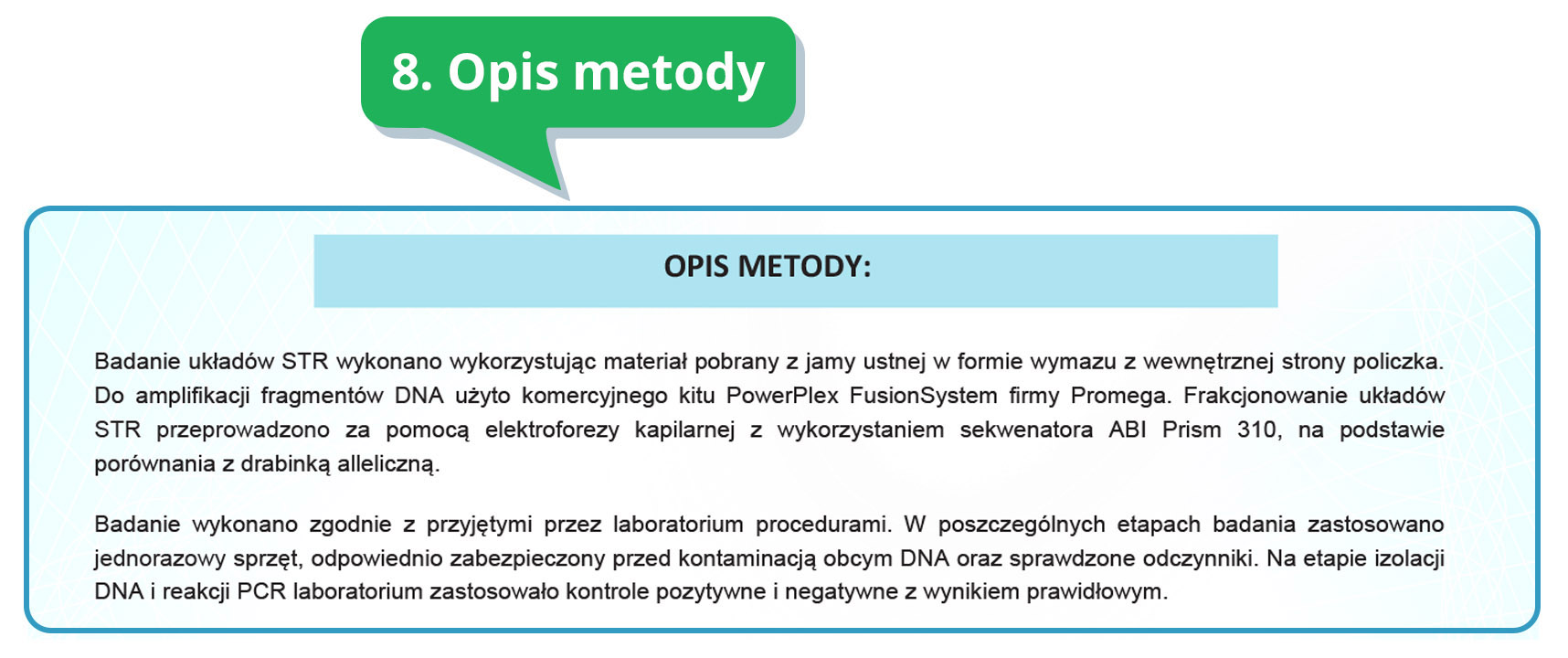 Liczba powtórzeń tych motywów jest przedstawiana w formie liczb i to Państwo widzą na wyniku badania. Konkretne motywy są dziedziczone od matki i od ojca, stąd w danym markerze widzą Państwo dwie liczby. Proszę nie sugerować się kolejnością tych liczb, bo ta wynika ze specyfiki elektroforezy kapilarnej, w czasie której mniejsze fragmenty DNA wędrują szybciej – niższe liczby zawsze będą występowały jako pierwsze w danym markerze.