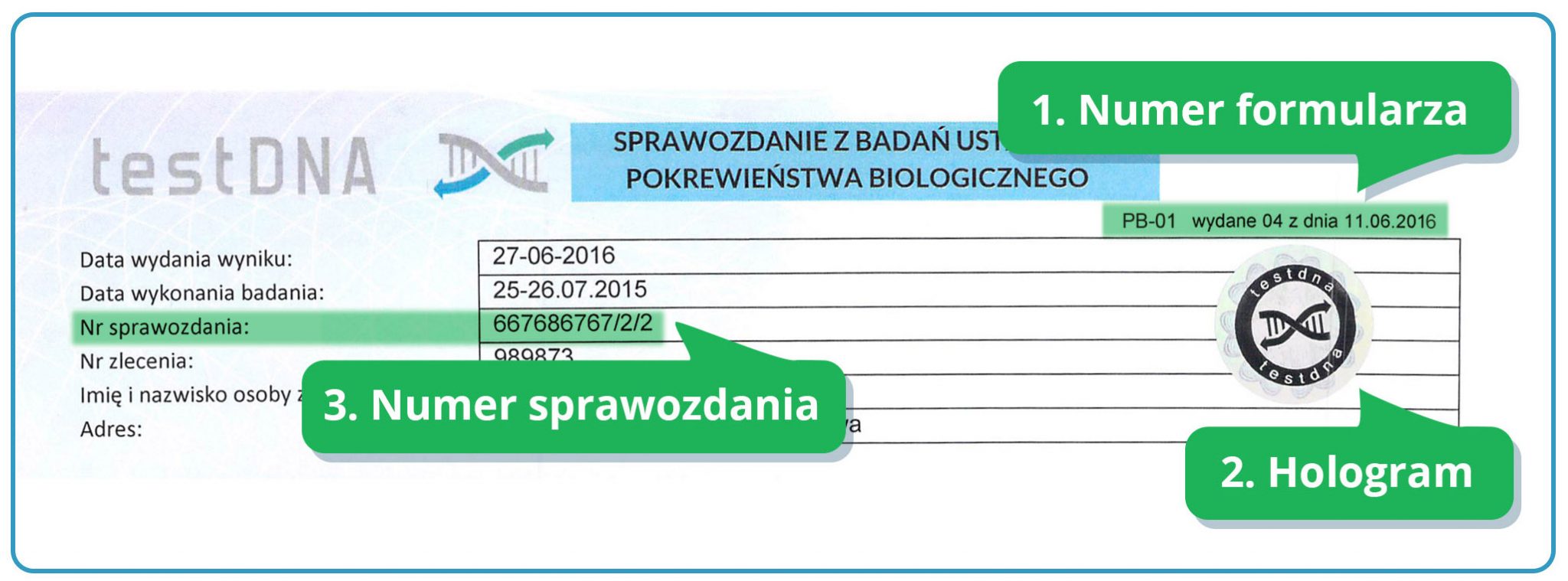 Oryginalne wyniki wydane przez testDNA sp. z o.o. zawsze zawierają nasz indywidualny hologram.