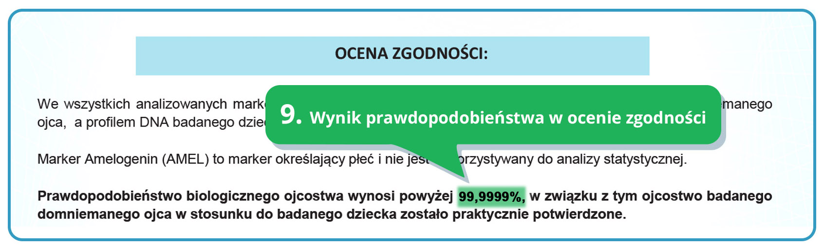 Według zaleceń Polskiego Towarzystwa Medycyny Sądowej i Kryminalistyki wynik, który potwierdza ojcostwo z bardzo wysokim prawdopodobieństwem, to taki, w którym uzyskujemy wartość powyżej 99,9999%. Z kolei prawdopodobieństwo ojcostwa w przypadku wykluczenia ojcostwa wynosić będzie 0%.