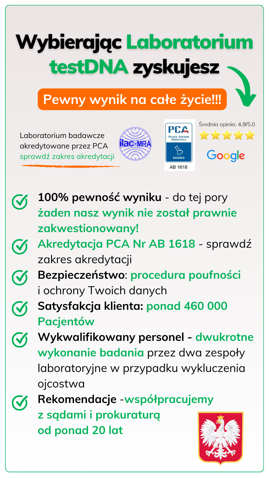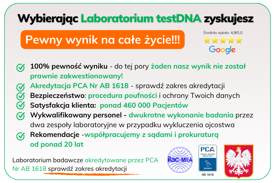 W swoich badaniach testDNA sp. z o.o. stosuje nawet aż 34 markerów genetycznych, dzięki czemu wynik jest dokładniejszy – zwłaszcza wtedy, kiedy badamy tylko ojca i dziecko.
