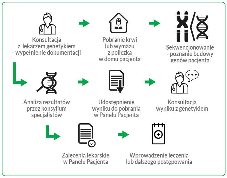 Podczas konsultacji lekarz przeprowadzi pełen wywiad medyczny. Na tej podstawie lekarz podejmie decyzję czy pacjent ma wskazania do wykonania badania WES. Następnie lekarz wypełni potrzebną dokumentację medyczną, opisując występujące objawy. Ponieważ analiza WES jest indywidualna, opis objawów jest kluczowy i może zdecydować o jej poprawności.