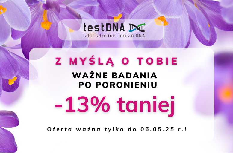 Dla Czytelniczek serwisu poronilam.pl przygotowaliśmy zniżkę 13% na wybrane badania genetyczne po poronieniu, dzięki którym można poznać przyczynę poronienia i lepiej przygotować się do kolejnej ciąży.