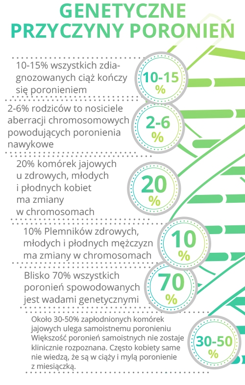 Najczęstsza przyczyna poronień to wady genetyczne płodu. Badanie materiału z poronienia (zarodka lub kosmówki) pozwala sprawdzić, czy to właśnie nieprawidłowości chromosomowe doprowadziły do straty. Najczęściej wykrywane wady to zespół Downa, zespół Edwardsa, Turnera i Patau.