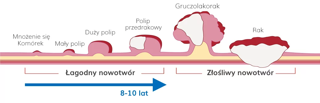 Jak widzisz na powyższym obrazku rak jelita zwykle może rozwijać się bardzo długo. Początkowo może nie dawać żadnych objawów. Jeśli w tym czasie zostanie wykryty można go łatwiej usunąć i tym samym zapobiec rozwojowi złośliwego nowotworu.