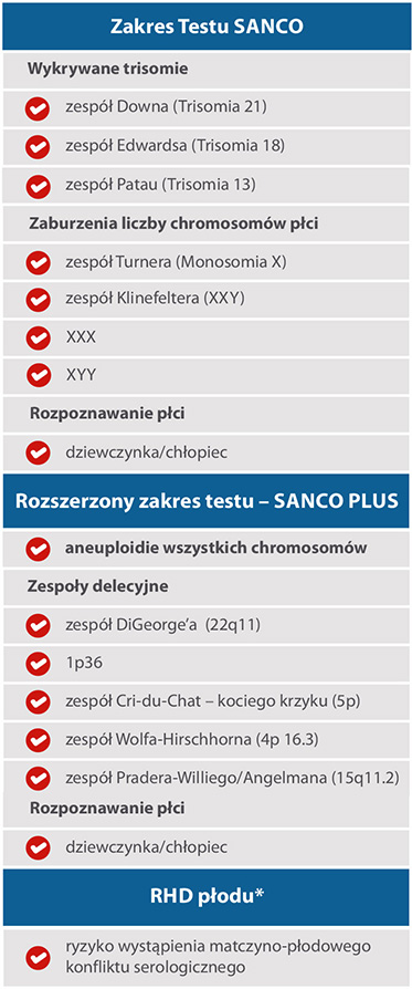 Test SANCO Plus: obejmuje m.in. aneuplodie wszystkich chromosomów oraz rzadkie zespoły delecyjne takie jak: zespół DiGeorge’a, 1p36, zespół Cri-Du-Chat (kociego krzyku), Zespół Wolfa Hirschhorna, Zespół Pradera-Williego/Angelmana.