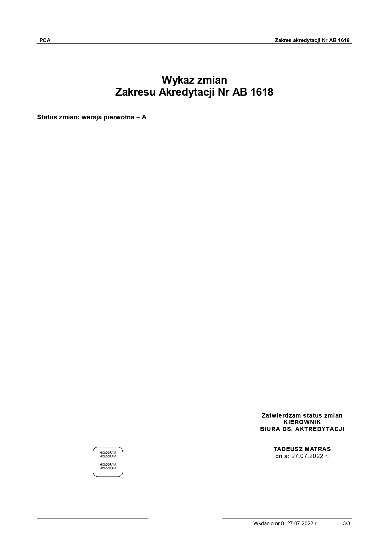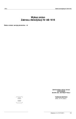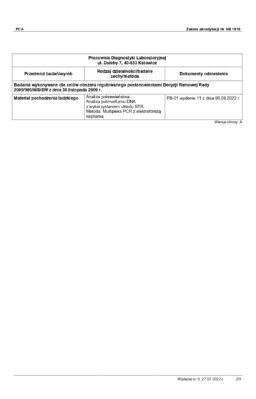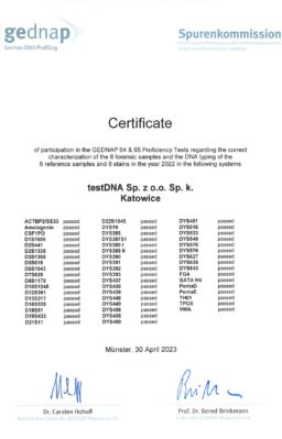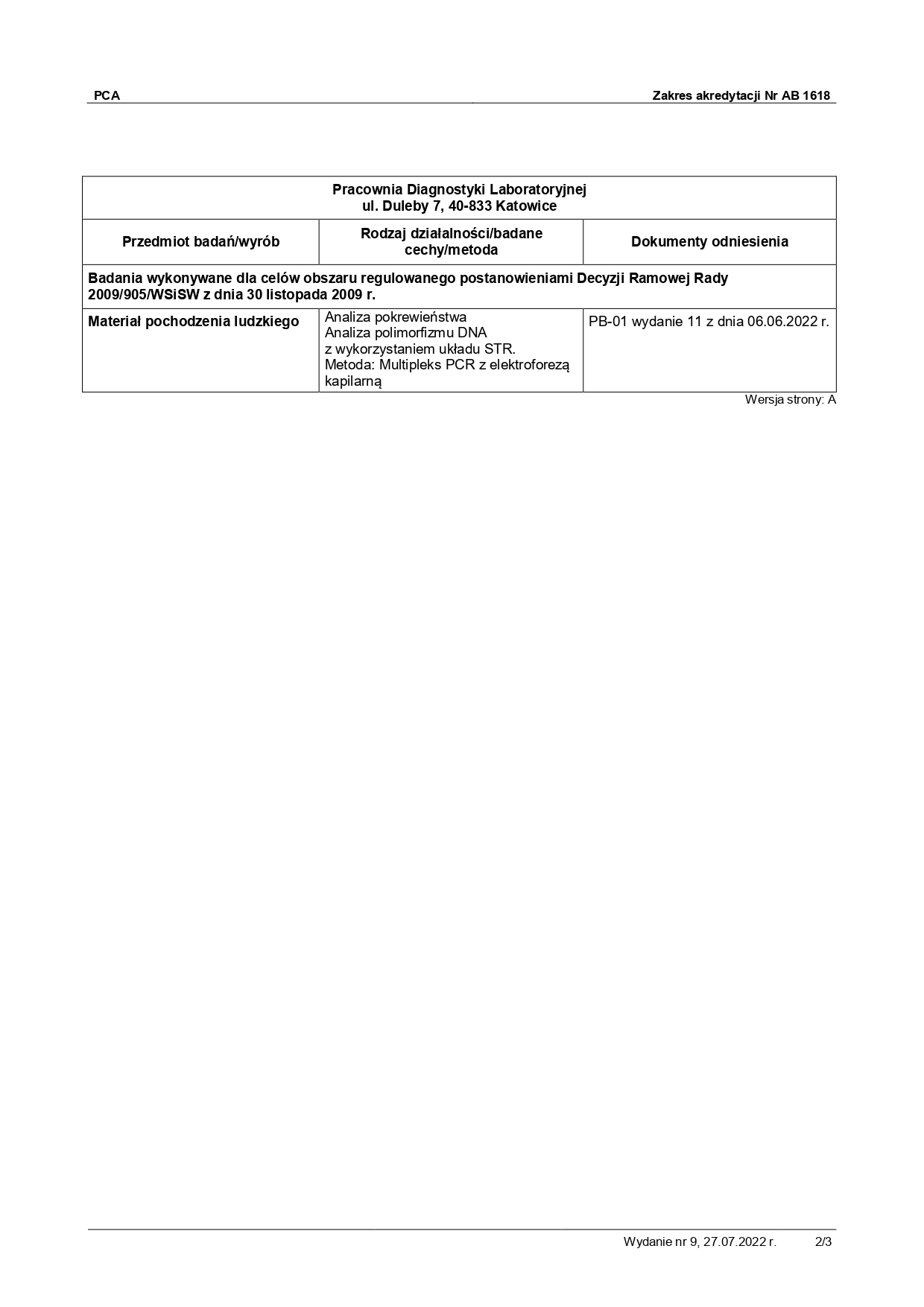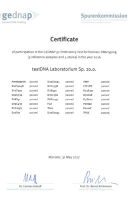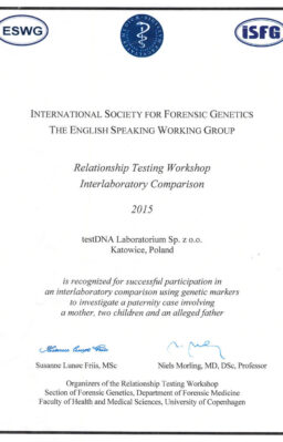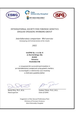 *zakres akredytacji obejmuje: Analiza pokrewieństwa, Analiza polimorfizmu DNA z wykorzystaniem układu STR. Metoda: Multipleks PCR z elektroforezą kapilarną w odniesieniu do wymagań PN-EN ISO/IEC 17025], [Nr AB 1618].