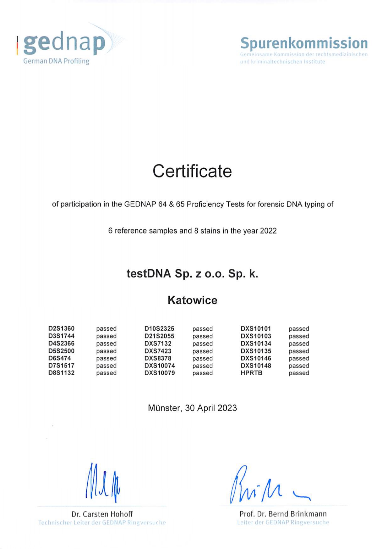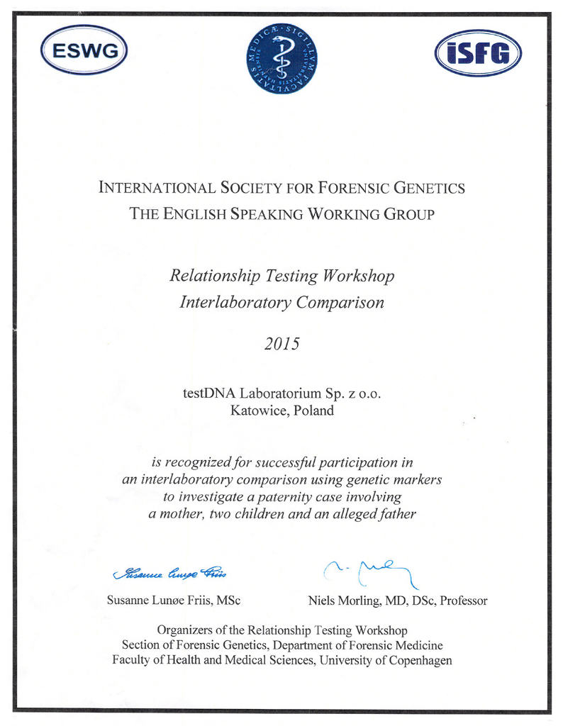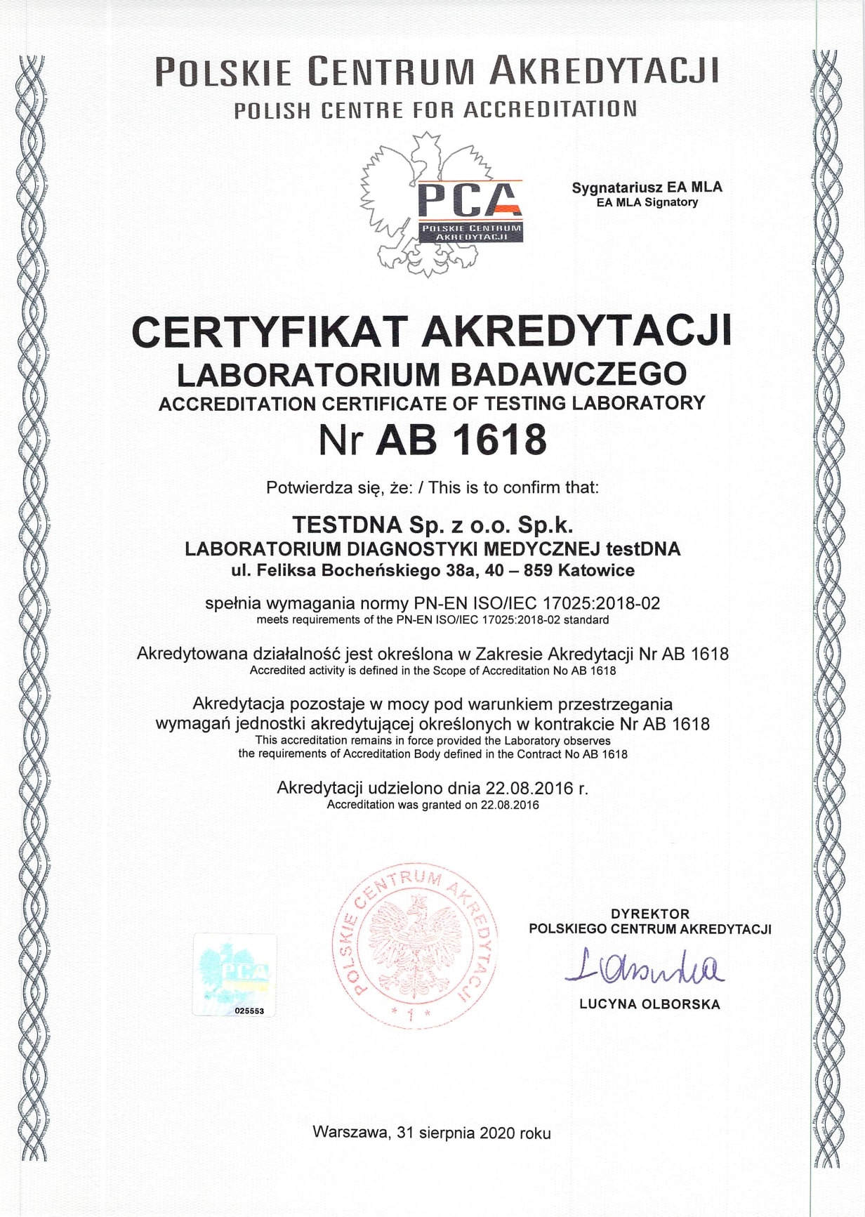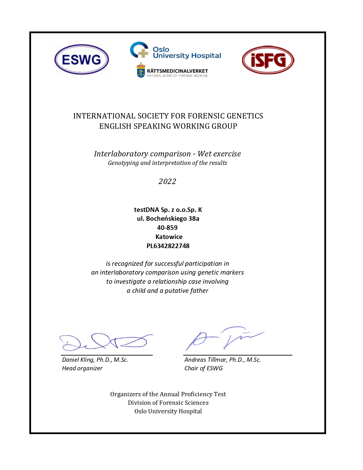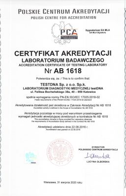 • Gwarantujemy wysoką jakość – testDNA Sp. z o.o. Sp. k. posiada liczne certyfikaty, regularnie poddaje się zewnętrznym kontrolom jakości badań DNA. TestDNA to laboratorium badawcze akredytowane przez Polskie Centrum Akredytacji*. Ponadto jako jedyne prywatne laboratorium w Polsce uzyskaliśmy m.in. 100% zgodność rezultatów w teście na ojcostwo w międzynarodowym programie biegłości CTS (Collaborative Testing Services) z akredytacją ISO/IEC 17043:2010.