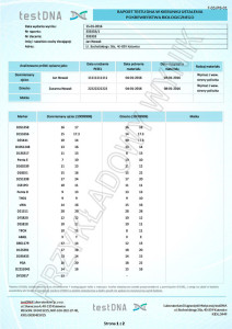 • Udostępniamy profile genetyczne – wynik zawiera pełny raport z przeprowadzonej analizy, m.in. tabelę z profilami genetycznymi, opis metody, słowną interpretację wyniku oraz informacje o jednostce wykonującej test [ZOBACZ przykładowy wynik].