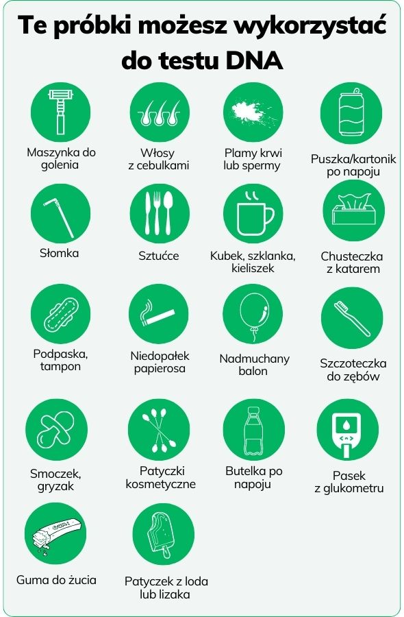 Próbki do testu na ojcostwo: szczoteczka, smoczek, chusteczka, włosy z cebulkami, ustnik, słomka, grzebień i inne