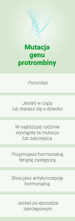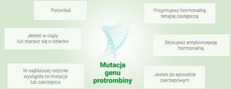 Czynnik II (protrombina) uczestniczy w procesie krzepnięcia krwi. Mutacja genu protrombiny jest przyczyną zwiększenia poziomu krzepliwości, co aż 2-3 krotnie zwiększa ryzyko wystąpienia choroby zakrzepowej oraz poronień i wewnątrzmacicznego obumarcia płodu. Badanie na mutację genu protrombiny jest przeznaczona do oceny ryzyka i/ lub przyczyn żylnej choroby zakrzepowo-zatorowej.