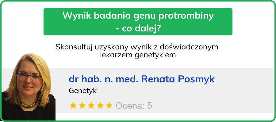 Uzyskany wynik badania mutacji genu protrombiny lub całego pakietu na trombofilię wrodzoną warto skonsultować z lekarzem genetykiem. Na tej podstawie oraz po zebranym wywiadzie z pacjentem, lekarz genetyk może wskazać odpowiednie dalsze zalecenia oraz zalecić leczenie przeciwkrzepliwe.