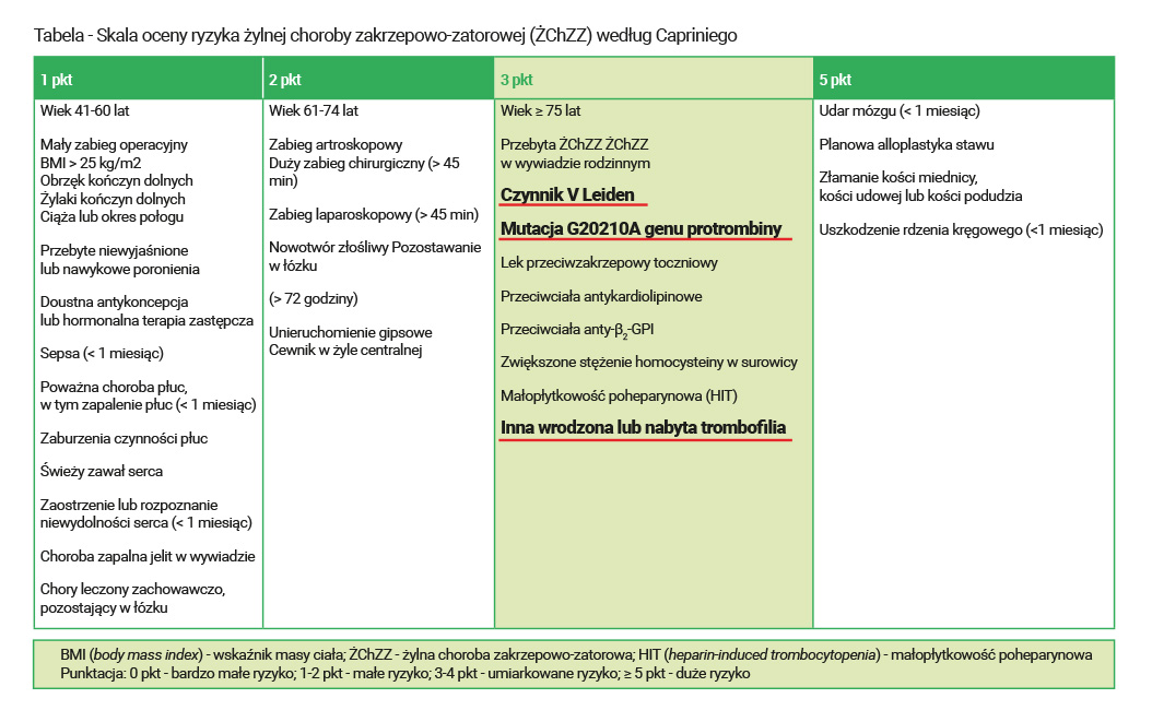 Skala oceny ryzyka żylnej choroby zakrzepowo-zatorowej (ŻChZZ) wg Capriniego wskazuje, że osobom z trombofilią wrodzoną (czynnikiem V Leiden, mutacją genu protrombiny) oraz ze zwiększonym stężeniem homocysteiny (co może wynikać z obecności wariantu genu MTHFR) znajdują się w grupie umiarkowanego ryzyka wystąpienia zakrzepicy.