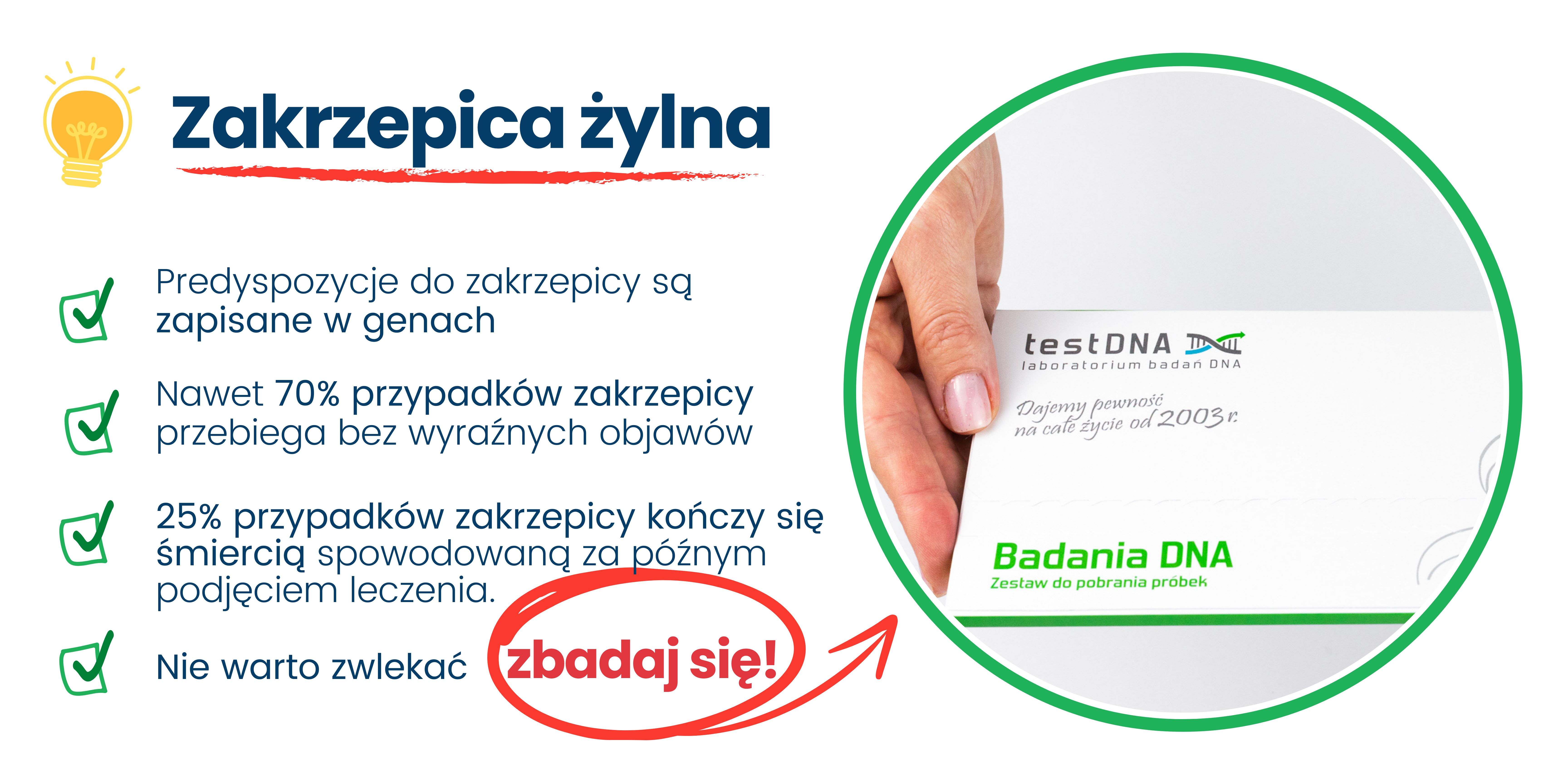 Ponad połowa pacjentów, u których wystąpiła zakrzepica posiada pewne zmiany w genach, które mogą powodować nadmierną krzepliwość i skłonność do tworzenia zakrzepów. Takie zmiany w genach są niewidoczne gołym okiem i nie dają zwykle żadnych objawów w życiu codziennym. Uaktywniają się pod wpływem pewnych czynników środowiskowych np. choroba, unieruchomienie, długa podróż, przyjmowanie określonych leków, palenie papierosów, ciąża, poród itp.