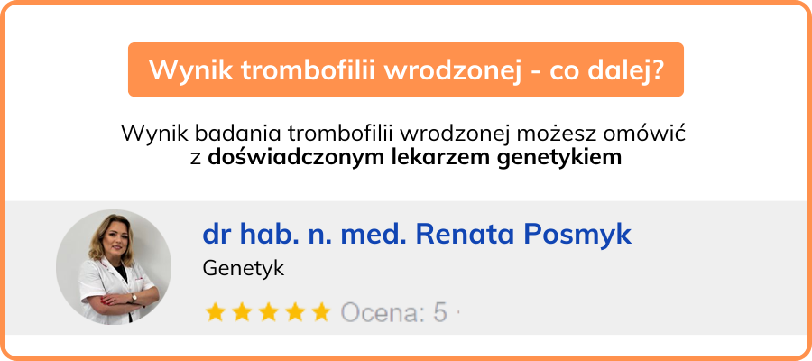 Wynik badania genetycznego w kierunku genetycznych predyspozycji do choroby zakrzepowo-zatorowej (trombofilia wrodzona) powinien być zawsze skonsultowany z lekarzem genetykiem. To on, na podstawie przeprowadzonego wywiadu z pacjentem oraz uzyskanego rezultatu badania, może dobrać odpowiednie leczenie, środki profilaktyczne lub zlecić ukierunkowaną, dalszą diagnostykę..