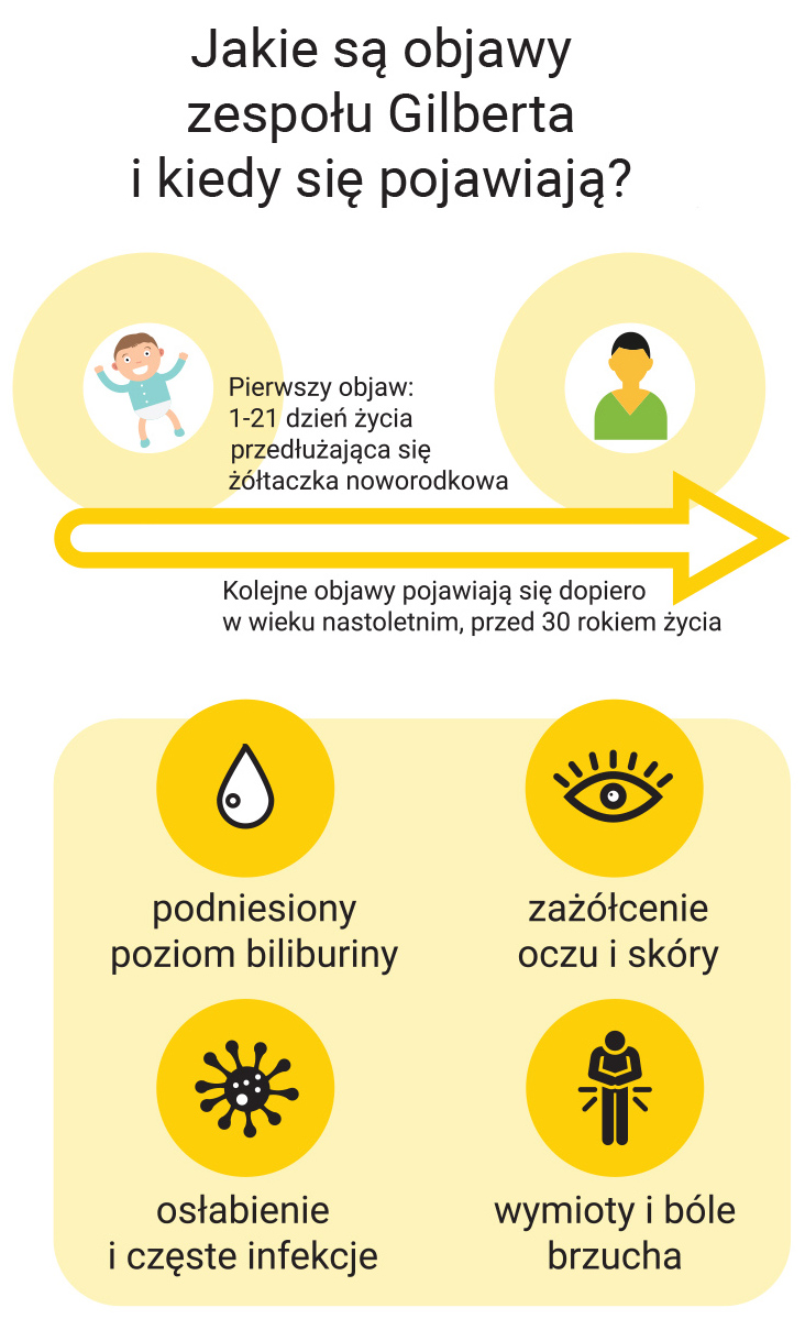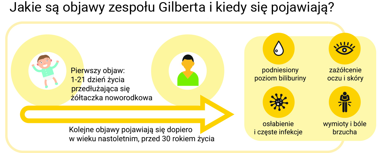 Osoba z zespołem Gilberta może cierpieć na okresowe zażółcenie oczu i skóry, mogą pojawić się mdłości i bóle brzucha, częste osłabienie i infekcje, a także złe samopoczucie po zażyciu leków.